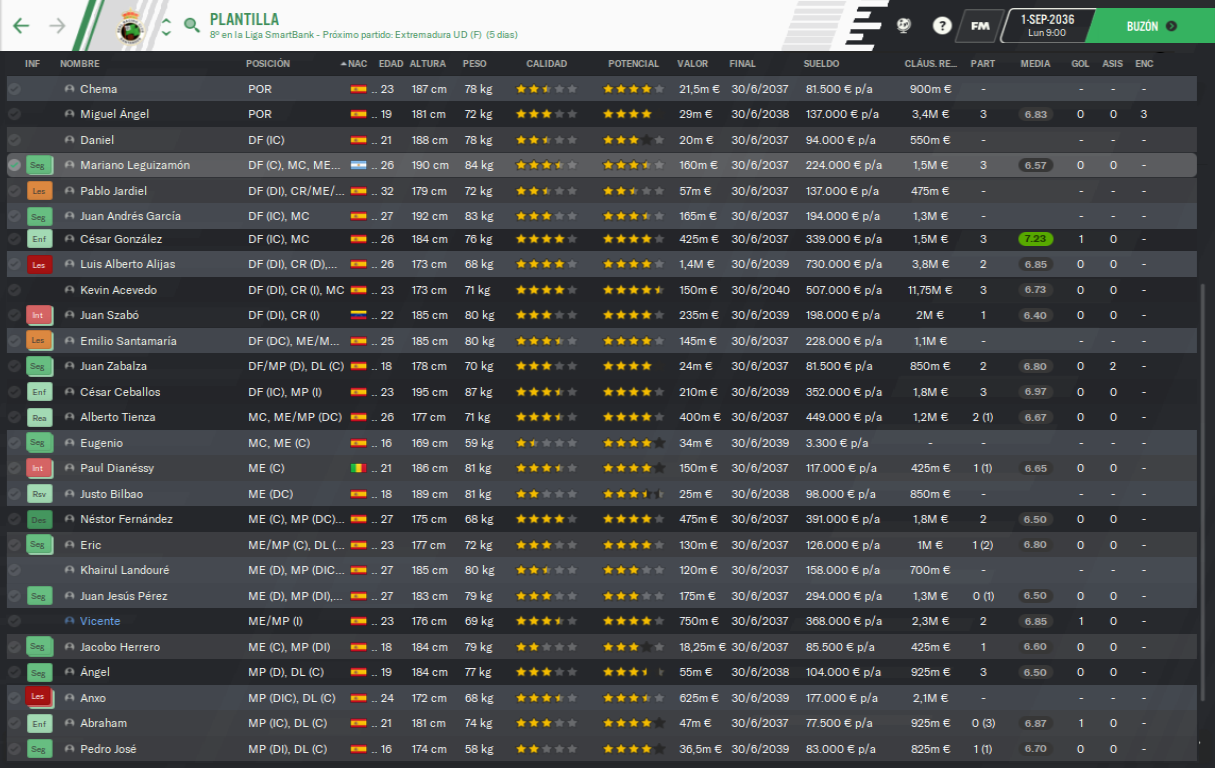 Grishin me informó de que Matvienko dio un importante paso en su carrera firmando por el Inter de Milán y ambos le felicitamos. Veremos si consigue hacer el mismo magnífico trabajo con Miguel Ángel y le convierte en otro portero de gran nivel. Vicente llegó cedido del recién ascendido Levante para cubrir la lesión de Anxo. Es un año más joven pero son muy parecidos en cuanto a nivel, sólo que a Vicente le gusta sobretodo recortar hacia dentro. Bolado se fue cedido de nuevo porque con Néstor y Eric el puesto de organizador está completo y terminamos los amistosos empatando frente al Espanyol en un gran partido. Antes del estreno liguero llegó Acevedo para el lateral zurdo por el mal rendimiento de Szabó el año pasado y Néstor seguía enfadado por no irse del club, aunque siga aquí porque rechazó el la oferta.